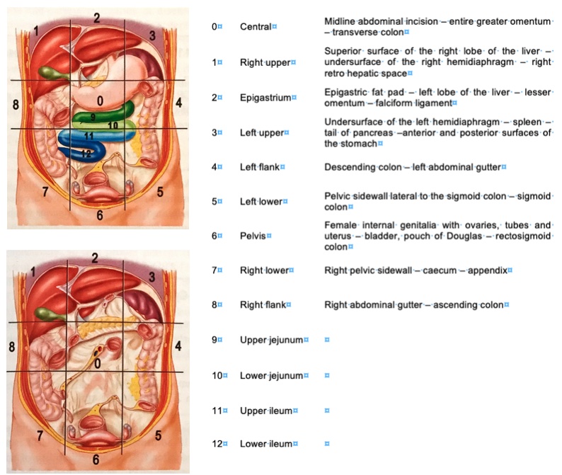 ΄ Η Κυτταρομειωτική Χειρουργική (Cytoreductive Surgery – CRS) ή κυτταρομείωση είναι μία χειρουργική επέμβαση με ιδιαίτερη ανάπτυξη τα τελευταία 30 χρόνια. Αρχικά, ξεκίνησε (σε συνδυασμό με την HIPEC) ως η ενδεδειγμένη θεραπεία για το ψευδομύξωμα του περιτοναίου. Στη συνέχεια, με την εξέλιξη των τεχνικών και των μελετών, απέκτησε πλέον ένδειξη σε μία σειρά από νεοπλασίες που αφορούν στο περιτόναιο. Πιο συγκεκριμένα, έχει εφαρμογή στον καρκίνο του περιτοναίου, είτε πρωτοπαθή, όπως το κακόηθές περιτοναϊκό μεσοθηλιώμα, είτε δευτεροπαθή, όπως για παράδειγμα το ψευδομύξωμα του περιτοναίου, οι περιτοναικες εμφυτευσεις από καρκίνο του παχέος εντέρου ή των ωοθηκών κ.α. Είναι για μία πολύωρη επέμβαση, η οποία συνδυάζει πολλές επεμβάσεις μαζί, τόσο της κλασικής χειρουργικής ογκολογίας, όσο και ιδιαίτερες τεχνικές αφαίρεσης του περιτοναίου, γνωστές ως περιτονεκτομές. Ο στόχος της κυτταρομείωσης είναι η αφαίρεση όλης της μακροσκοπικά ορατής (δηλαδή, που βλέπει το γυμνό μάτι) νόσου. Αυτό απαιτεί την αφαίρεση οργάνων που έχουν προσβληθεί από την νόσο (π.χ. λεπτό έντερο, παχύ έντερο, σπλήνας, μήτρα, ωοθήκες). Ωστόσο, ο χειρουργός αφαιρεί και την μεμβράνη που καλύπτει την κοιλία (περιτόναιο) όπου έχει νόσο. Ακόμα, μπορεί να γίνει αφαίρεση και άλλων οργάνων ή δομών με κίνδυνο ανάπτυξης νόσου (π.χ. χοληδόχος κύστη, επίπλουν, σύνδεσμοι ήπατος). Τέλος, η πολύωρη και πολύπλοκη αυτή επέμβαση μπορεί να συνδυαστεί με την HIPEC, όπου αυτό έχει ένδειξη. Το πόσες πολλές εκτομές είναι απαραίτητες αντιστοιχεί στην έκταση του όγκου μέσα στην κοιλιά. Την έκταση της νόσου την μετράμε με την κλίμακα PCI (Peritoneral Cancer Index). Το PCI score κυμαίνεται από 0 ως 39. Αρχικά, με το PCI διαιρούμε την κοιλιακή χώρα σε 13 τμήματα. Πιο συγκεκριμένα, τα εννέα τμήματα (από 0 ως 8) αφορούν χώρους της κοιλίας (0: κεντρικό, 1: άνω δεξιά, 2: επιγάστριο, 3: άνω αριστερά, 4: πλάγια αριστερά, 5: κάτω αριστερά, 6: πύελος, 7: κάτω δεξιά, 8: πλάγια δεξιά). Στη συνέχεια, τα υπόλοιπα τέσσερα τμήματα αντιστοιχούν στο λεπτό έντερο (9: εγγύς νήστιδα, 10: άπω νήστιδα, 11: εγγύς ειλεός, 12: άπω ειλεός). Έπειτα, σε κάθε ένα από τα τμήματα αυτά αποδίδουμε ένα βαθμό μεγέθους βλάβης (Lesion Size Score – LS) από 0 ως 3, όπου 0 αντιστοιχεί σε καθόλου νόσο, 1 σε νόσο μέχρι 5 χιλιοστά, 2 αντιστοιχεί σε νόσο μέχρι 5 εκατοστά και 3 σε νόσο μεγαλύτερη των 5 εκατοστών ή κατάληψη των επιφανειών της περιοχής. Τέλος, το άθροισμα των παραπάνω αντιστοιχεί σε ένα σκορ από 0 ως 39, που είναι το PCI score. είναι ένας δείκτης που ουσιαστικά μετριέται κατά τη διάρκεια της λαπαροτομίας (ανοικτού χειρουργέιου). Επίσης, το PCI μπορεί να υπολογιστεί από την αξονική τομογραφία (ct-PCI), καθώς και με τη λιγότερο επεμβατική ερευνητική λαπαροσκόπηση αξιολόγησης της νόσου (ls-PCI). Αν και οι προσεγγίσεις αυτές πλησιάζουν την πραγματικότητα, πολύ συχνά υποεκτιμούν την έκταση της νόσου. Ακόμα, υπάρχει και το παθολογοανατομικό PCI score (pt-PCI), το οποίο είναι η τελική βαθμολογία που έχει η νόσος μετά και από την ιστολογική εξέταση των όγκων που αφαιρούνται. Επιτυχής θεωρείται η κυτταρομειωτική χειρουργική όταν επιτυγχάνεται πλήρης ή σχεδόν πλήρης κυτταρομείωση. Πιο συγκεκριμένα, η παρακάτω βαθμονόμηση αποδίδει την αποτελεσματικότητα της κυτταρομειωτικής χειρουργικής: Πληρότητας Κυτταρομείωσης (Completeness of Cytoreduction – CC): Αυτό που πρέπει να γίνει κατανοητό είναι ότι η κυτταρομειωτική χειρουργική είναι διαφορετικό κομμάτι από την HI